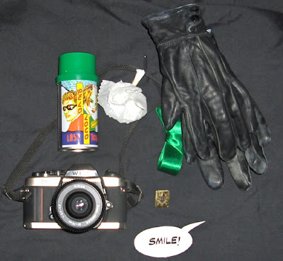 El atuendo se complicaba un poco pues nadie que yo conozca tiene en su closet un traje, gabardina o algo similar de color morado... así que busqué lo más parecido, una chamarra de piel con solapas, unos guantes de piel (que me quedaban muy chicos), una camisa negra, un sombrero de tela y un listón verde para el moño y listo!... una tela negra de fondo, un globito con la palabra SMILE! y a tomar fotos!